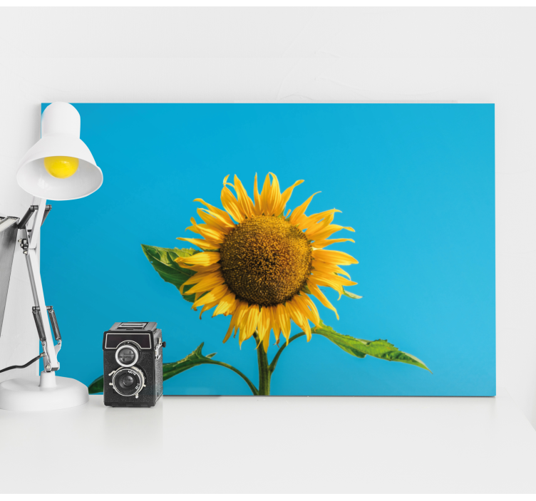Reference: Q6665En livlig solsikke står høj mod en klar blå baggrund. Dens gyldne kronblade stråler udad og omkranser en struktureret central skive. Friske grønne blade strækker sig fra stilken og fremhæver den naturlige skønhed i denne iøjnefaldende blomsterkomposition, perfekt til at tilføre et glædeligt præg til ethvert rum.