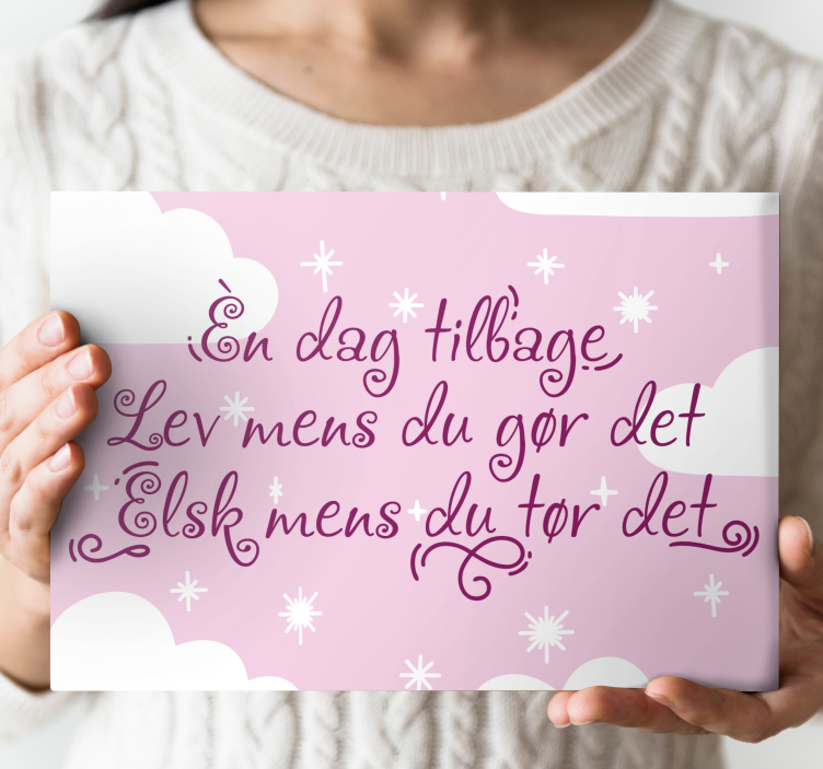 Få dette design og nyd at have en drømmende tegneseriehimmel med tekst, der vil se godt ud på din væg. Designet har en lyserød himmelbaggrund med hvide stjerner og skyer. Kalligrafi-citat med lilla tekst, der viser bogstaverne fra denne ikoniske norske søn. Hvis du kun havde én dag tilbage, bør du indrette dit soveværelse med dette design. Pink tegnefilm himmellærred med sangtekster i lilla farve, som du kan have i forskellige størrelser. Den leveres færdigmonteret, og den er nem at installere.