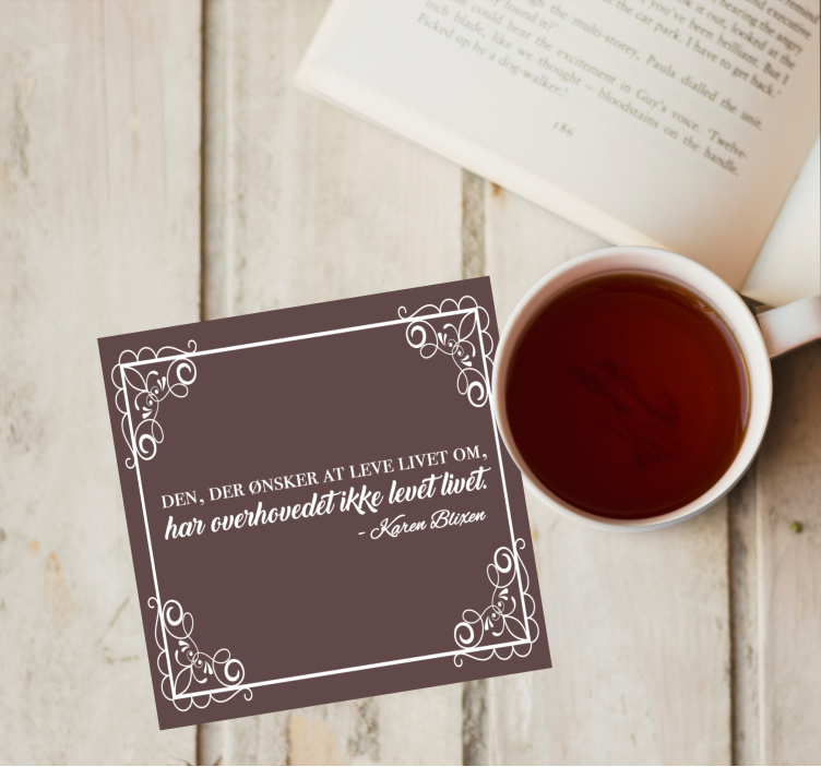 Denne unikke drinkscoaster er designet med et inspirerende citat fra Karen Blixen om at leve livet. Coasteren har en cool brun baggrund med en dekorativ kant, der tilføjer et stilfuldt touch til dit hjem.