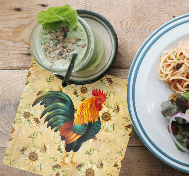 Reference: B3617En livlig hanekam er centralt placeret mod en baggrund af solsikker, hvilket skaber et livligt gårdinspireret motiv. Den detaljerede fjerdragt af hanen viser et spektrum af farver, der øger dens visuelle appel. Dette design indfanger essensen af rustik charme og naturens skønhed.