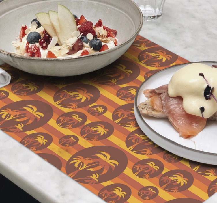 Reference: M3449Fremhæver en levende sammensætning af tropiske palme designs arrangeret i cirkler og striber. Den varme farvepalet forstærker den sommerlige stemning, hvilket gør det til et perfekt valg til afslappede middagssituationer.