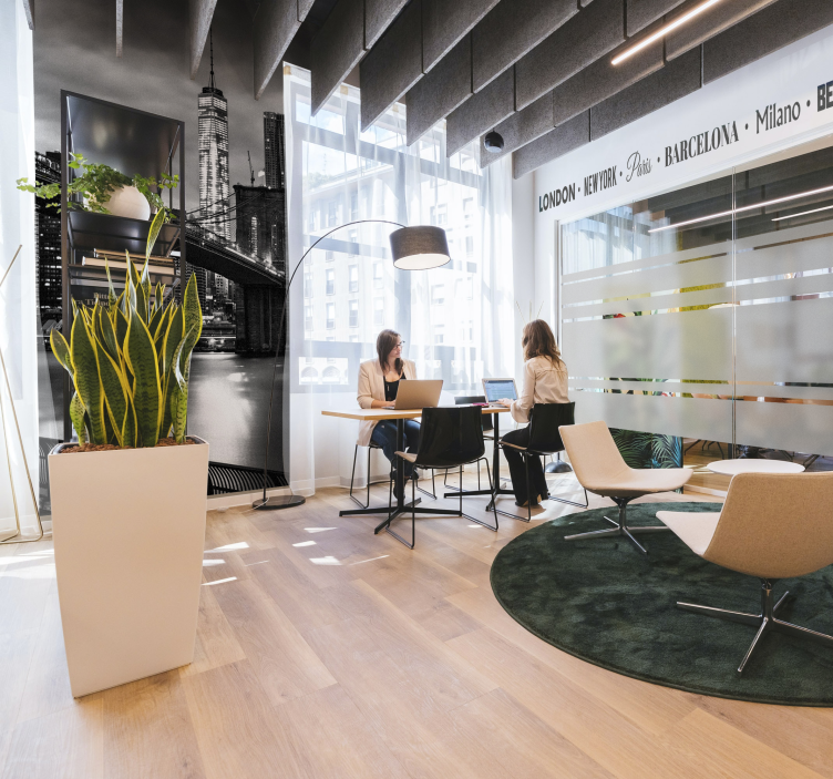 Reference: F12189Et moderne kontorområde præsenterer to personer, der deltager i et møde, med et iøjnefaldende vægmaleri af byens skyline, der viser ikoniske vartegn. En livlig plante tilføjer et strejf af natur, hvilket forbedrer det interaktive miljø. Designet understreger en kombination af byliv og professionelt samarbejde.