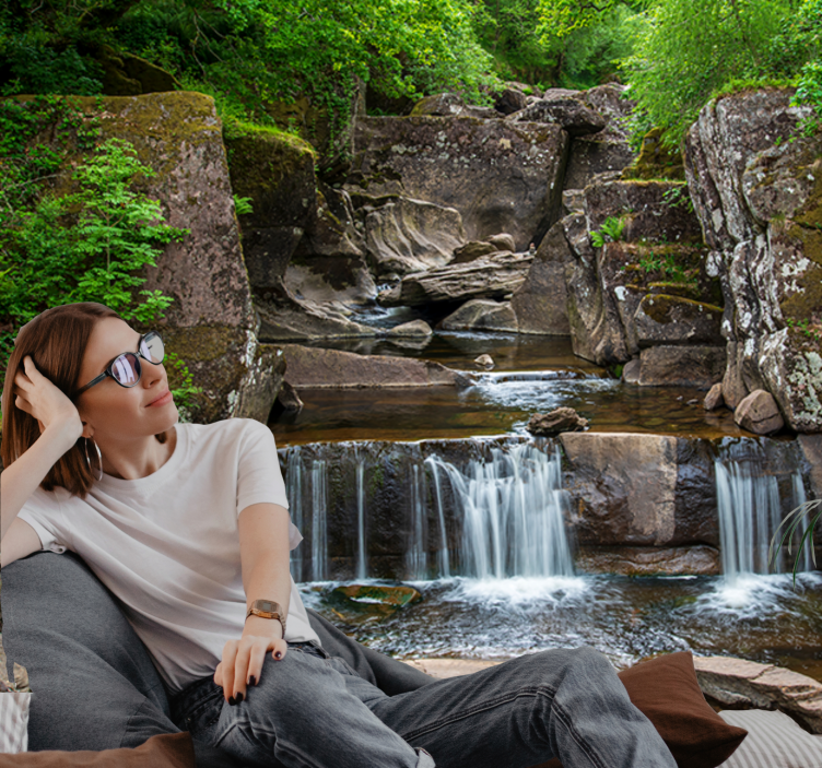 Reference: F12155Scenen viser et fængslende vandfald, der strømmer over ujævne klipper, omgivet af livlig grøn vegetation. Dette fredelige landskab indbyder til afslapning og fremhæver naturens skønhed i sin reneste form, hvilket gør det til en ideel ramme for fornyelse og fred.
