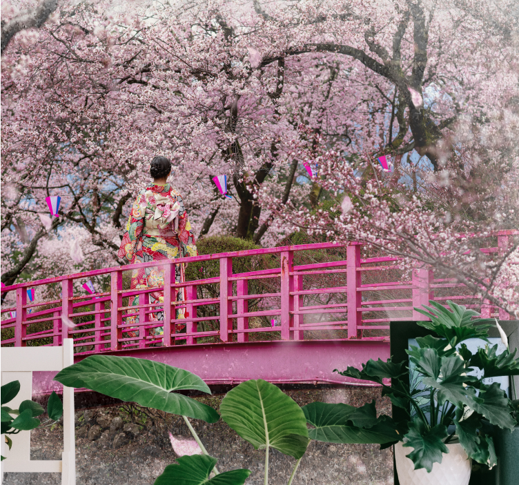 Reference: F12031En fredfyldt skildring af kirsebærblomster i fuldt flor, der indrammer en traditionel figur på en pink bro. De sarte lyserøde blomster skaber en rolig atmosfære, som forstærkes af de farverige dekorationer omkring, der legemliggør skønheden i natur og kultur.