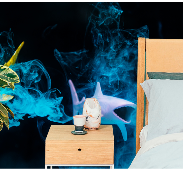 Oplev den fantastiske verden under havet med vores fototapet dyr farverig haj illustration. Dette grafiske design præsenterer en betagende haj svømmende gennem det klare vand, omgivet af røg og livlige marine elementer, der skaber en magisk atmosfære. Med denne fotomontage får du ikke blot et dekorativt element, men også en invitation til at udforske ocean-ets dybder og hav liv i dit hjem.
