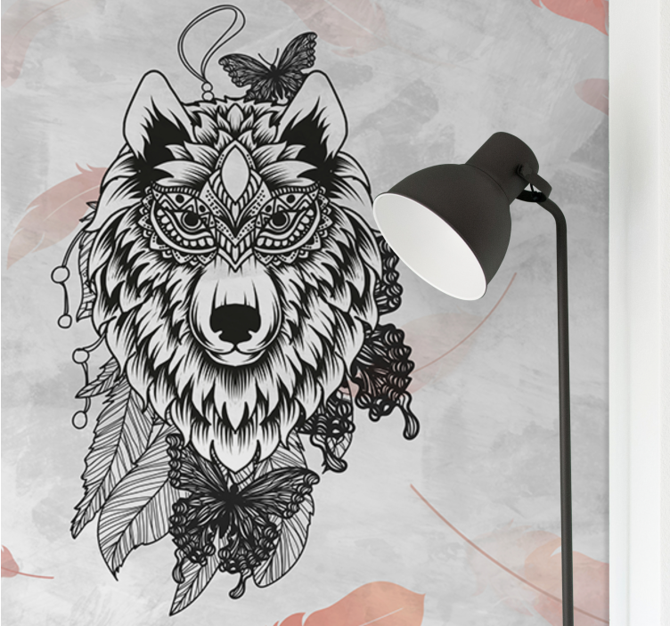 Reference: F10807Et indviklet design med en ulv i centrum, prydet med majestætiske mønstre. Omkring ulven er der delikate sommerfugle og stiliserede blade, hvilket skaber en fængslende og kunstnerisk repræsentation af dyrelivet. Dette værk afspejler en harmonisk blanding af natur og kunst.