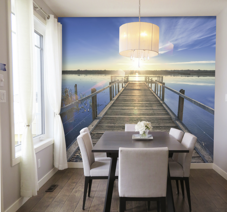 Vores landskaft fototapet pier solnedgang udsigt landskab fototapet er den ideelle løsning til at forvandle dine vægge til en visuel oase. Dette tapet fanger essensen af naturens ro og skønhed, hvilket gør det til den perfekte tilføjelse til stuer, soveværelser eller kontorer. Det skaber en unik atmosfære, der fremmer velvære og giver et friskt pust til din indretning. Gør dit hjem til et sted, hvor du kan nyde hverdagens små øjeblikke blandt naturskønne udsigter!
