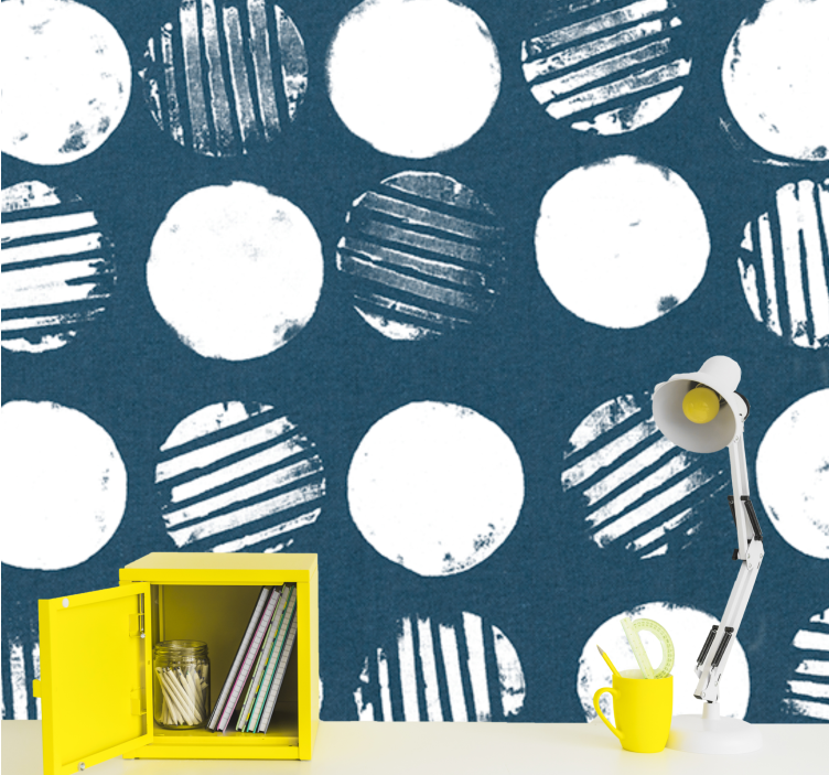 Reference: F12130Dette design præsenterer en fængslende sammensætning af cirkler, nogle solide og andre med stribede mønstre, alt sammen sat mod en dyb blå baggrund. Variationerne i tekstur tilføjer dybde og skaber et moderne og kunstnerisk udtryk, der forbedrer den samtidige æstetik.