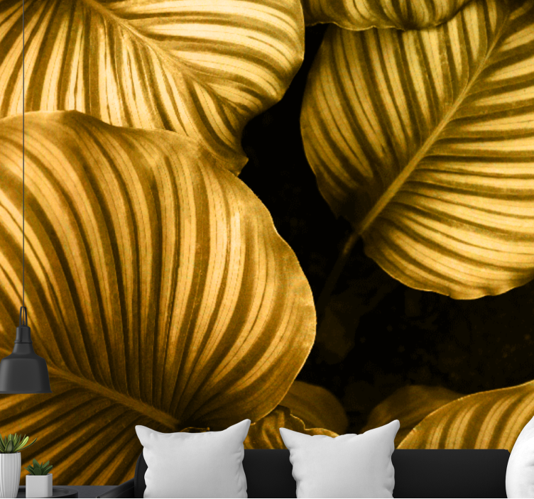 Velkommen til en verden af skønhed med vores solsikke fototapet med gyldne bladmønstre, der bringer naturens magi ind i dit hjem. Dette grafiske design, der prydes af blade og blad mønstre, skaber en tropisk atmosfære, som vil forvandle ethvert rum. De gyldne nuancer og de teksturerede elementer giver en dybde og elegance, som vil imponere dine gæster og skabe en varm og indbydende stemning.