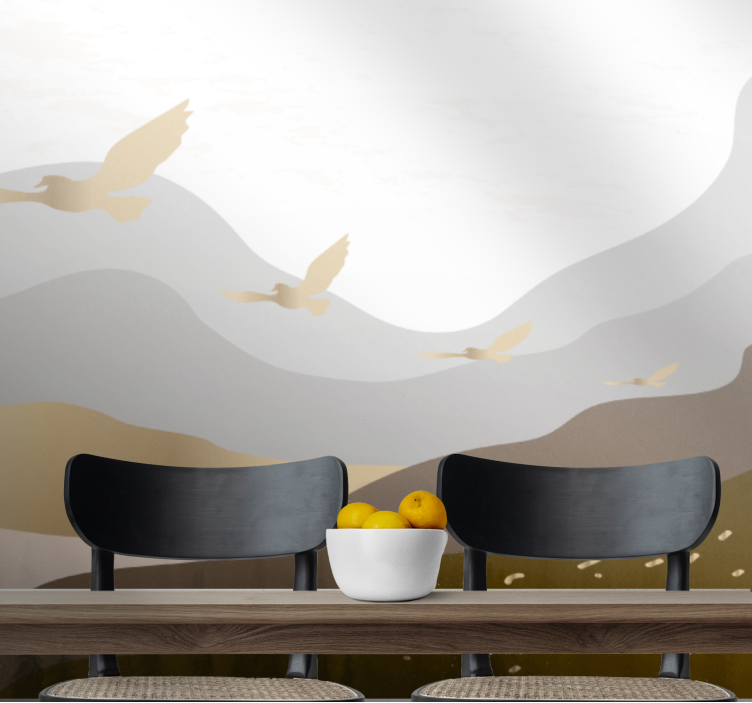 Oplev den betagende skønhed af vores Tapet natur med silhuetter af flyvende fugle, der pryder dine vægge med en fantastisk grafisk illustration. Designet fanger øjet med smukke fugle der svæver over bjerge, mens silhuetter skaber en drømmende atmosfære i dit hjem. De gyldne nuancer tilføjer et elegant touch til enhver indretning, og den naturlige stil vil inspirere til ro og harmoni.