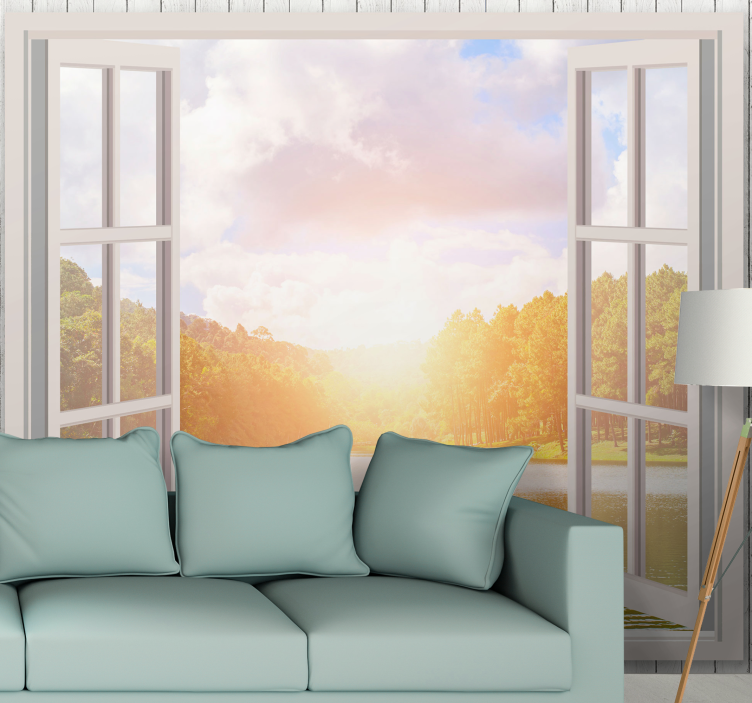 Reference: F12132En rolig scene, der skildrer en solopgang over en fredfyldt sø, indrammet af et åbent vindue. Luksuriøs grønne områder pryder bredden, med smukke træer, der spejler sig i vandet. Det bløde lys skaber en fredfyldt atmosfære, der inviterer til ro og afslapning.