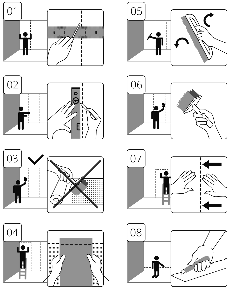 * På grund af limens tørringsproces anbefales det ikke at anvende tapeter i rum med lav luftfugtighed og med temperaturer under 10ºC. Den optimale temperatur under påføring og tørring er mellem 18-21ºC