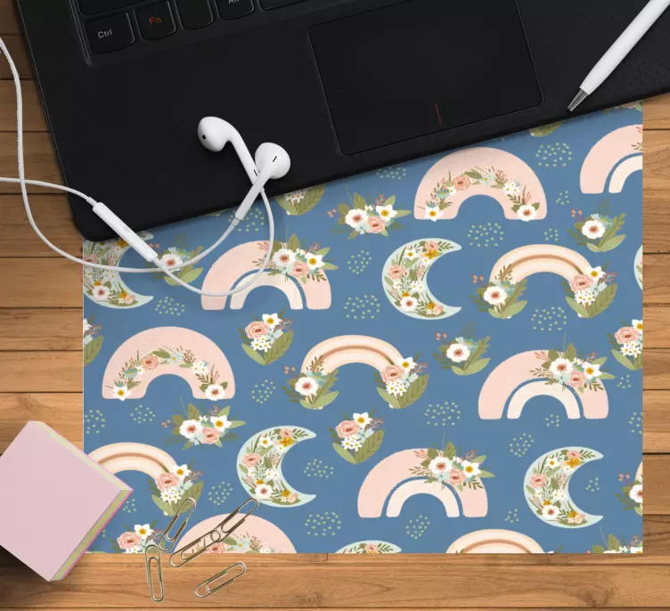 Dette børnemønster med foråret regnbue musemåtte er perfekt til at gøre dit skrivebordsområde smukt. Musemåtten er lavet af vinyl og har en regnbueillustration med lyserøde blomster. Designet er sjovt og passer til både børn og teenagere, der nyder at bruge musen til spil eller arbejde på computeren.