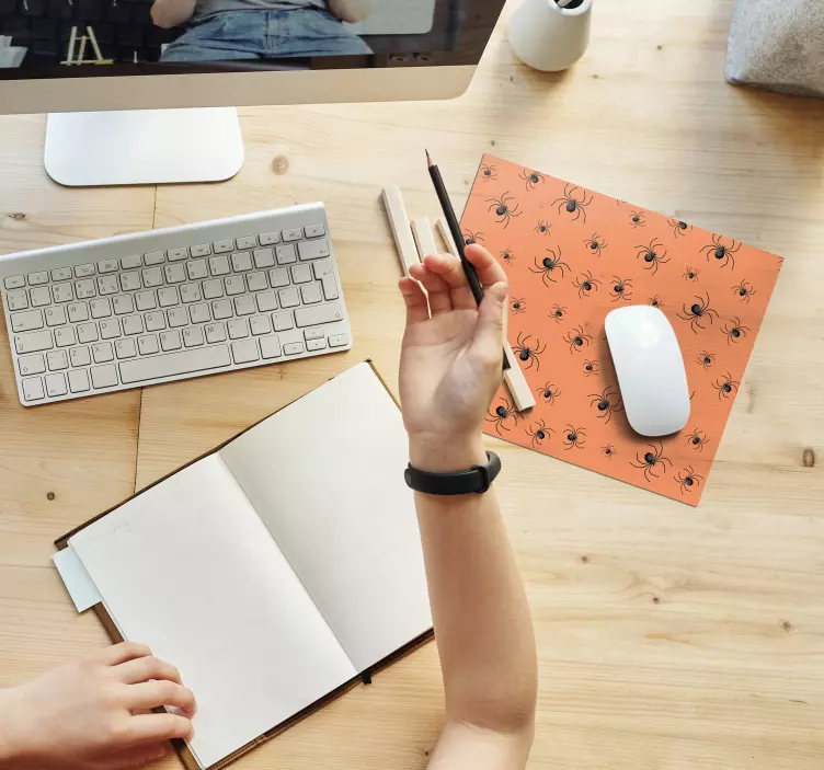 Reference: N3379En engagerende overflade med et edderkoppemønster i orange og sort. Designet indeholder flere edderkoppeikoner spredt ud over, hvilket skaber en legesyg, men alligevel uhyggelig æstetik, perfekt til gaming-entusiaster eller temafester.