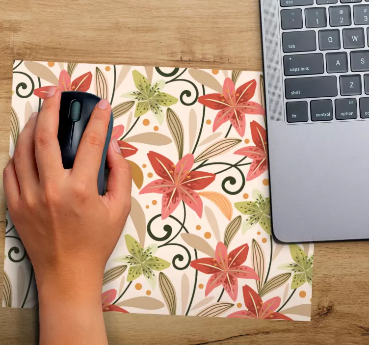 Reference: N4832Et livligt blomstermønster præger dette design, som har intrikate blomster og blade, der er flettet sammen med blide svungne linjer. Brugen af bløde, varme farver fremkalder en følelse af natur og ro, hvilket gør det til et perfekt supplement til ethvert arbejdsområde eller personligt rum.