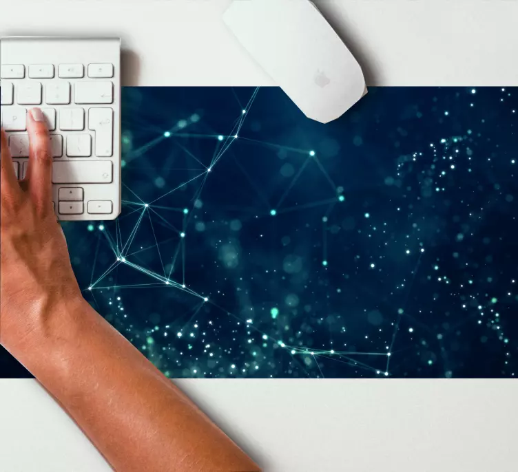 Reference: N3827Et indviklet mønster med sammenkoblede linjer og lysende punkter, der skaber en moderne og teknologisk inspireret æstetik. Dette design anvender en blanding af abstrakte geometriske former, der fremkalder forestillinger om forbindelse og innovation, perfekt til at forbedre ethvert arbejdsområde eller personligt rum.
