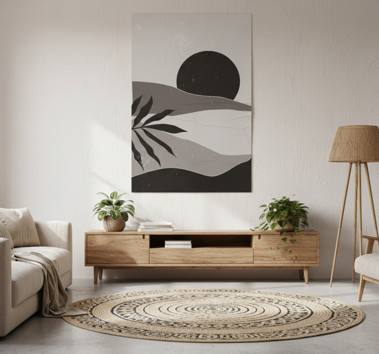Dette moderne opholdsrum har et minimalistisk design med et stort abstrakt maleri, der skildrer et roligt landskab. Domineret af jordnære toner fremhæver kunstværket en dristig sol mod bløde bakker og delikat løv. Komplementeret af møbler i naturligt træ og hyggelige tekstiler, udstråler rummet ro og stil. Oplev vores fantastiske plakat stue sort og hvid solnedgang i ørkenen, der bringer en unik grafisk elegance ind i dit hjem. Med en imponerende 180g/m2 gramvægt, en halvmat finish uden reflekser og en høj farveintensitet, er denne plakat designet til at fange øjet og skabe en stemning af ro og skønhed. Den sorte og hvide farvepalet giver et stilrent look, der passer perfekt ind i enhver stue og tilføjer et strejf af kunstnerisk flair.