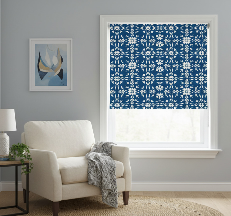 Blå rullegardin med hvidt flise mønster