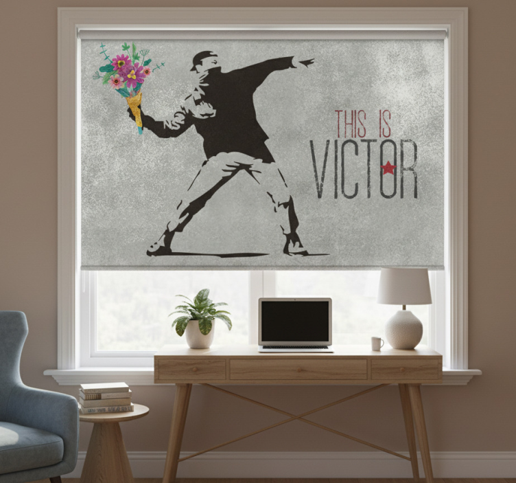 Vores grå rullegardin med personlig bansky blomsterbuket er den perfekte løsning til at forbedre indretningen af dit rum. Dette elegante rullegardin beskytter ikke blot mod direkte sollys, men giver også privatliv, når det er sænket. Det unikke design tilføjer karakter til ethvert rum, samtidig med at det regulerer rumtemperaturen og skaber en behagelig atmosfære. Gør dit hjem til et stilfuldt tilflugtssted med dette fantastiske produkt!