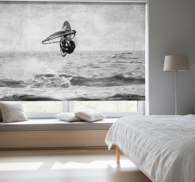 Reference: E9990Oplev det stilfulde grå rullegardin windsurf sort og hvid, der bringer et moderne og grafisk udtryk ind i dit hjem. Dette rullegardin kombinerer en elegant farvepalet med funktionalitet, hvilket gør det til det ideelle valg til enhver indretning. Med sin unikke tekstur og design skaber det en atmosfære af ro og stil, samtidig med at det beskytter mod direkte sollys og giver dig privatliv, når det er sænket.