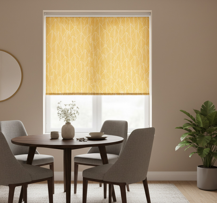 Gule rullegardiner med bladmotiv