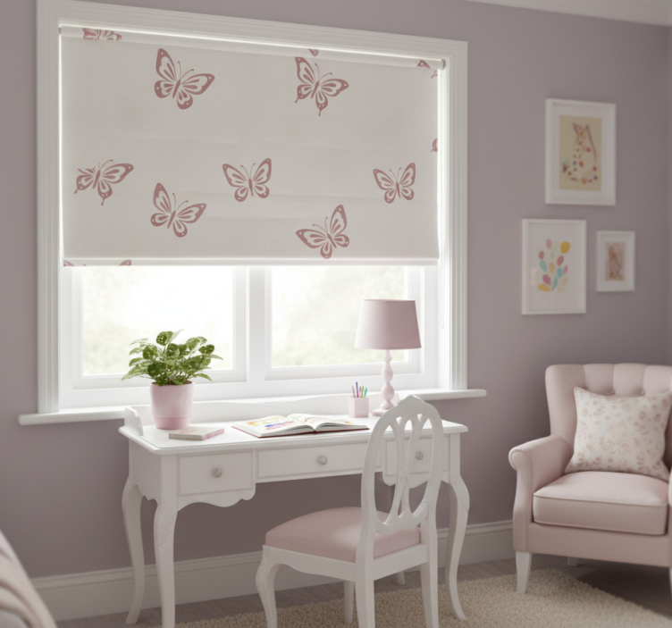 Lyserøde rullegardiner med eventyrlige sommerfugle