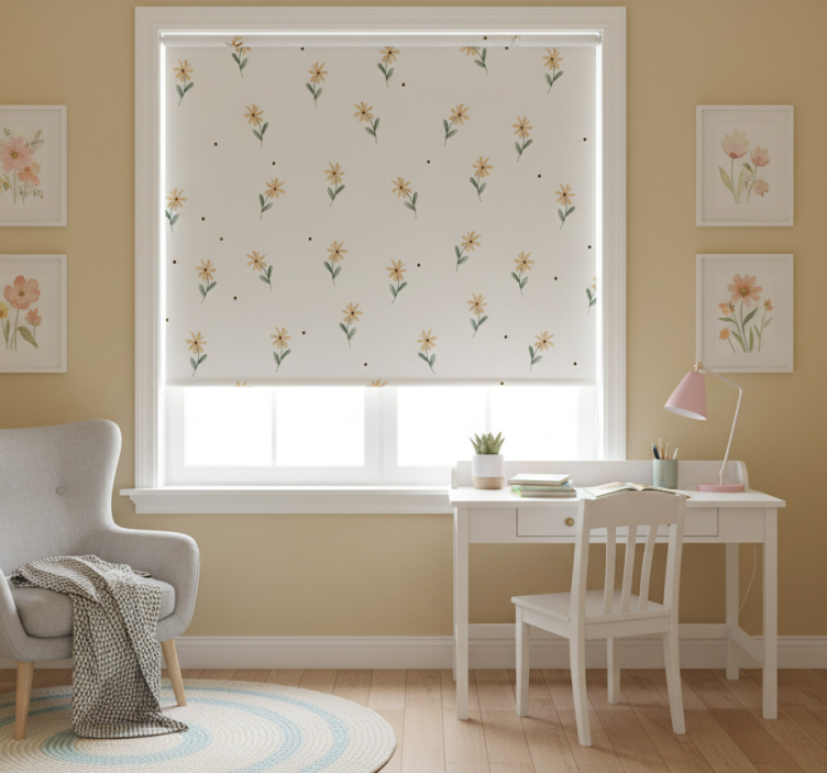 Lyserøde rullegardiner med gule margueritter