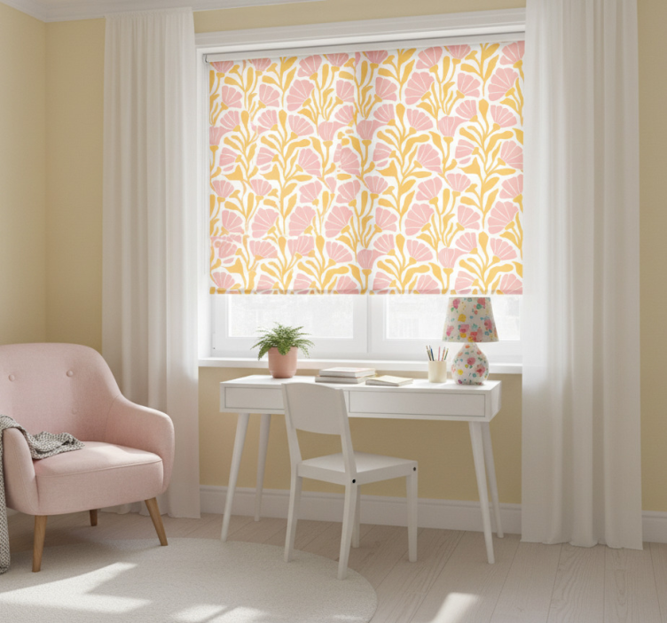 Lyserøde rullegardiner med moderne farverigt blomstermønster