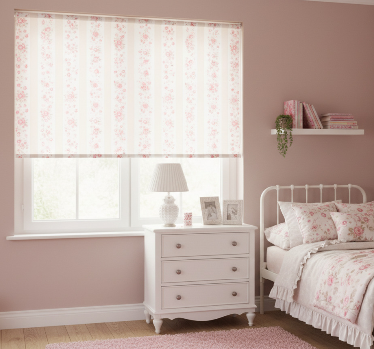 Lyserøde rullegardiner med retro blomsterstriber