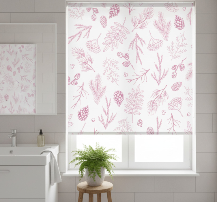 Rullegardin til badeværelse hvid baggrund med lyserød fyr