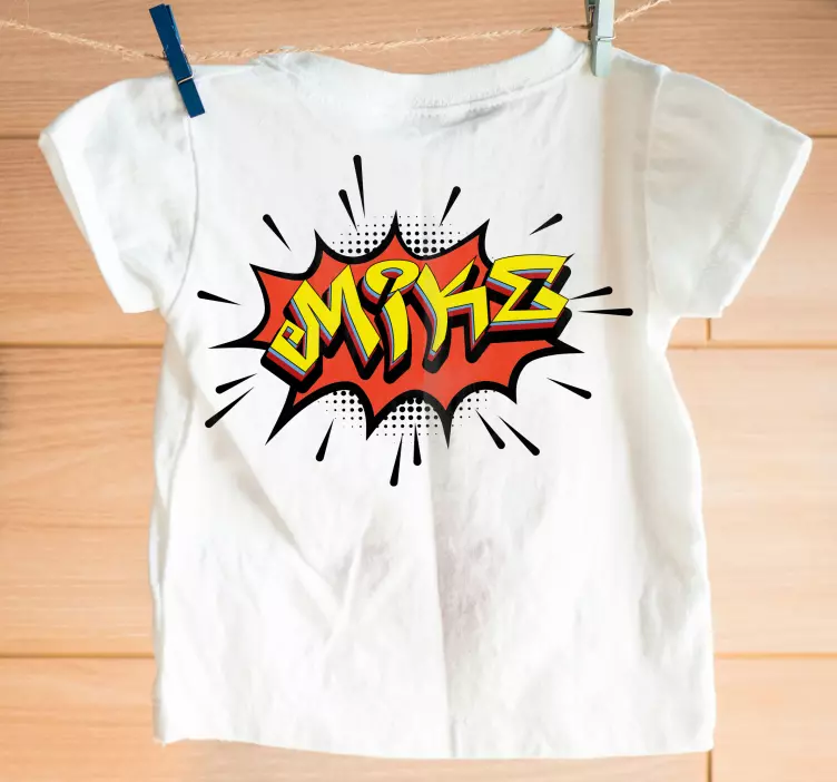 Reference: T4538Dette legende design har et livligt komisk burst med navnet 'Mike' tydeligt vist. De dristige farver og dynamiske former skaber en energisk appel, perfekt til en sjov og glad atmosfære for børn.