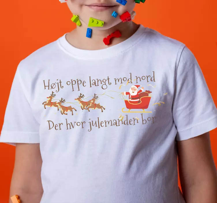 Bringer det dine barndomsminder tilbage? Og får du din helt rigtige julestemning. Denne julesang-t-shirt har et rigtig sødt design af julemanden og hans rensdyr med en sangtekst fra en gammel julekalender.