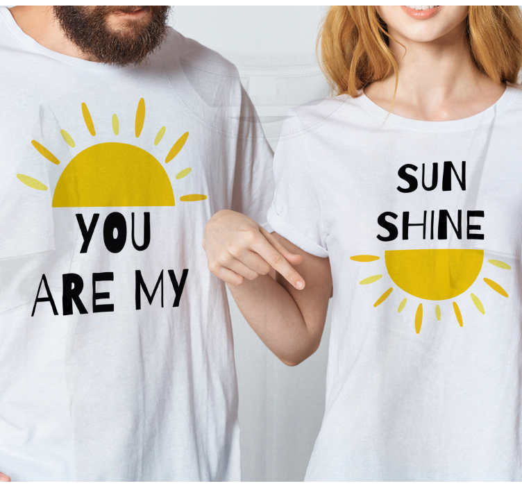 Reference: T5107Dette charmerende design præsenterer et par iført matchende toppe dekoreret med glade solmotiver og varme, kærlige sætninger. De solrige farver vækker følelser af glæde og forbindelse, hvilket gør det til et perfekt valg for at udtrykke kærlighed på en dejlig måde.