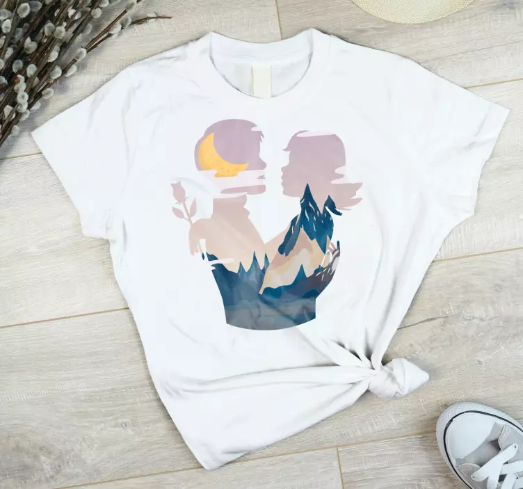 Oplev den mor og datter t-shirt forbindelse i silhuet, der fanger essensen af ømhed og familiebånd. Dette grafiske design kombinerer en nipponesisk æstetik med naturskønne elementer som bjerge og en måne, der symboliserer den dybe kærlighed mellem mor og datter. Illustrationens detaljer bringer et legende og varmt udtryk, som fejrer det særlige bånd, der eksisterer mellem et par af elskende sjæle.
