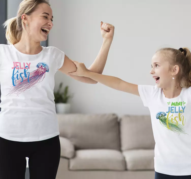 Reference: T5235Dette livlige billede viser en mor og datter, der deler glade øjeblikke, begge iført matchende toppe med farverige billeder af meduser. Det legende design fremhæver deres bånd og skaber en sjov, farverig atmosfære, perfekt til at udtrykke kærlighed og samhørighed.