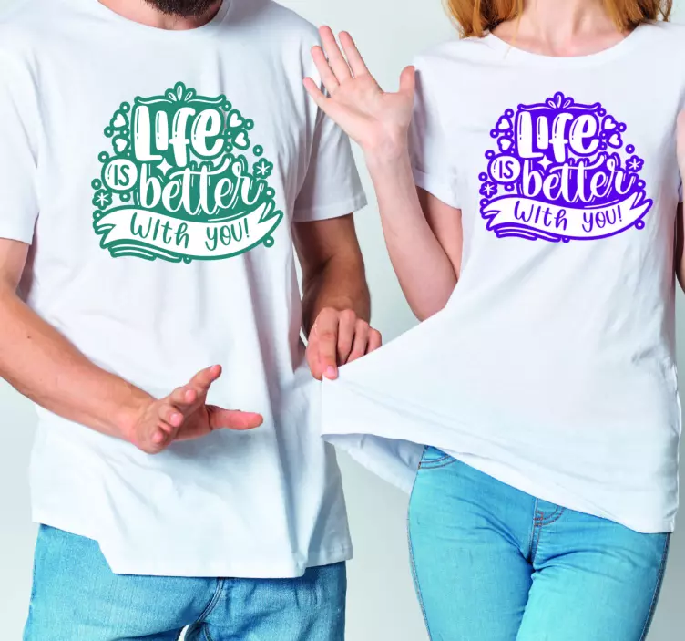 Reference: T4107Dette design fremhæver en glad besked, der understreger glæden ved selskab. Vist på matchende tøj skaber den livlige tekst og dekorationer en varm atmosfære, perfekt til at udtrykke kærlighed og enhed. Ideelt til fejringer eller afslappede udflugter, resonerer det med temaer om forbindelse og lykke.