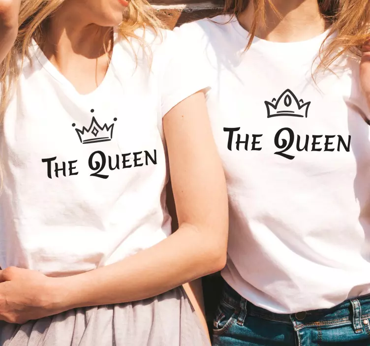 Reference: T4073Dette billede viser et hjertevarmt øjeblik mellem en mor og datter, der begge bærer matchende outfits, som stolt viser sætningen 'The Queen.' Det legende design, fremhævet af kroner, symboliserer deres særlige bånd og delte øjeblikke af glæde.