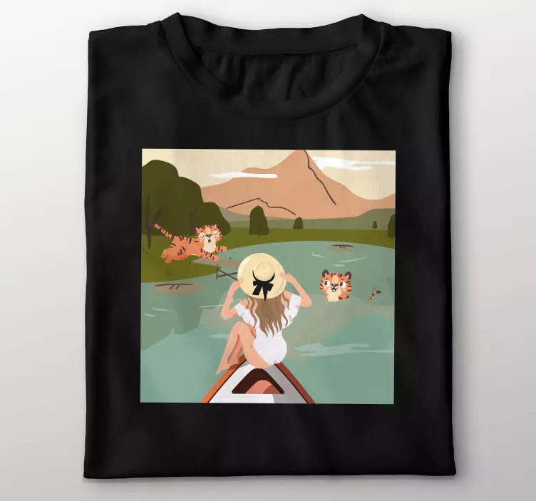Oplev den fantastiske Original t-shirt eventyr med tigre, hvor grafisk kunst møder naturens skønhed! Denne unikke t-shirt prydes af en livlig illustration, der fanger øjeblikket af en pige, der udforsker et landskab fyldt med tigre, dyr og en betagende sø. Den tegneserie-inspirerede design gør den perfekt til udendørs eventyr, hvor du kan føle dig afslappet og i harmoni med naturen.