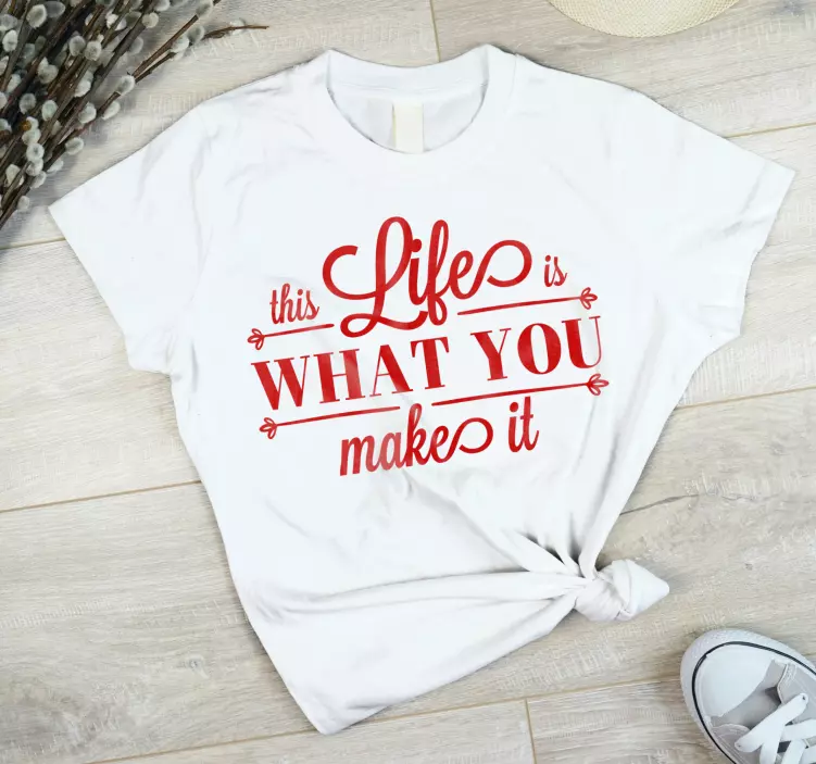 Reference: T4937Dette design indeholder et stærkt motiverende citat, der understreger temaet om, at livet er, hvad du gør det til. Den fede skrift og de livlige farver fanger opmærksomheden, hvilket gør det til et fremragende valg til afslappet tøj for at inspirere positivitet.