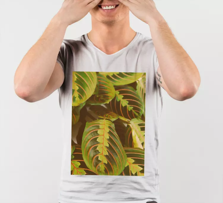 Oplev den unikke charme ved vores Original t-shirt med grønt bladmønster, der præsenterer et grafisk design inspireret af naturens skønhed. Denne t-shirt er prydet med maranta, eksotiske blade, og et tropisk jungle tema, der skaber en botanisk illustration med malede detaljer. Den grønne farve giver en frisk og levende følelse, mens strukturen af materialerne tilføjer dybde til designet.