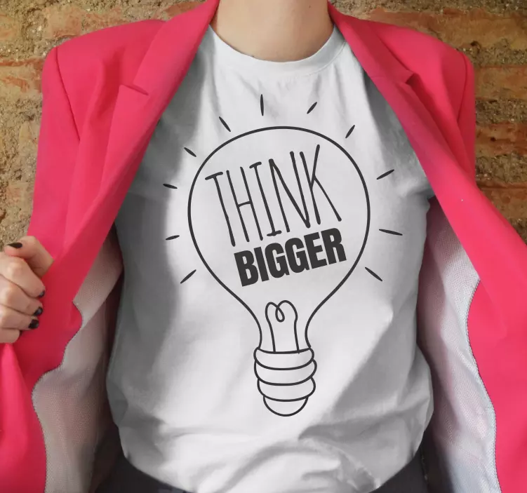 Reference: T4862Dette design viser en pære med sætningen 'Think Bigger' i fede bogstaver. Billedet vækker en følelse af inspiration og positiv tænkning, ved at bruge enkle, men kraftfulde visuelle elementer, der resonerer med et motiverende tema.