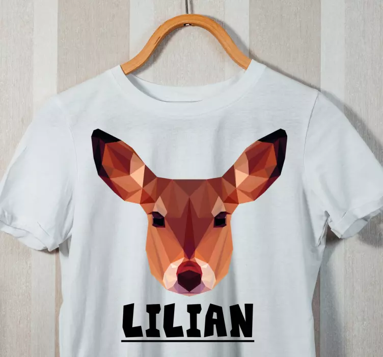 Oplev vores original t-shirt med stilfuldt hjortehoved, som præsenterer et unikt grafisk design. Dette fantastiske design kombinerer geometriske former med et imponerende hjort- og rensdyransigt, der fanger essensen af dyrelivet i en moderne tegneserie-stil. Den polygonale fremstilling i dette design tilføjer en spændende dimension, og den gør det muligt at tilpasse t-shirten med dit eget navn, hvilket virkelig gør den personlig og stilfuld!