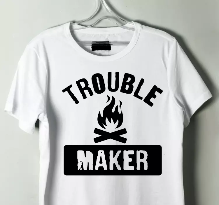 Reference: T5448Dette iøjnefaldende design har fed tekst, der siger 'Trouble Maker', ledsaget af flamme- og bål-symboler. Det er perfekt til dem, der omfavner en sjov og eventyrlig ånd. Kontrasten mellem sort og hvid tilføjer et element af spænding og fanger opmærksomheden uden besvær.