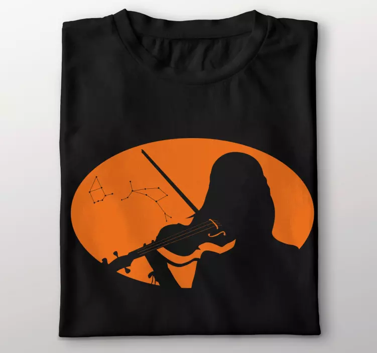 Reference: T4530Dette slående design viser en silhuet af en violinist under en stjernesky med stjernebilleder i baggrunden. Den livlige orange cirkel står i smuk kontrast til det sorte stof, hvilket gør det til et perfekt valg for musikelskere. Ideelt til særlige lejligheder eller afslappet brug.