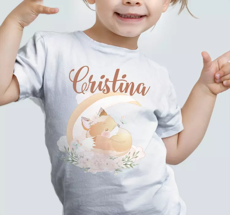 Reference: T4668Dette yndige design viser en sovende ræv, prydet med blomster og en halvmåne. Den bløde farvepalet forstærker charmen, hvilket gør det perfekt til børn. Det personlige navn tilføjer et unikt præg, der appellerer til forældre, der søger tilpasset tøj til deres små.