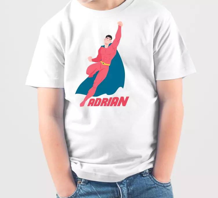 Reference: T4420Med en dynamisk superheltekarakter i livlige farver fanger dette design ånden af eventyr og sjov. Den energiske positur, fremhævet af den flagrende kappe, appellerer til børn og bringer spænding til deres garderobe. Perfekt til festlige anledninger, legemliggør det glæde og fantasi.