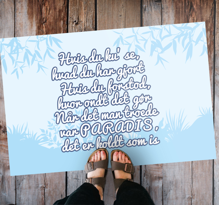 Få dette design og nyd alle de unikke elementer, som du kan bruge til at ændre udseendet af dine gulve til enhver tid. Dette er mere end blot en simpel dekoration. Dette produkt er lavet med de bedste materialer, der er tilgængelige på markedet, og din tilfredshed i tankerne. Du kan beskytte og forskønne udseendet af dine gulve. Skridsikre materialer og kvalitetsdesign, som du kan bruge i ethvert rum. Brug den i din stue, soveværelse, badeværelse eller endda køkken. Nyd dette farverige design med et ikonisk dansk citat. Blåmalet vinyl tæppe med sjovt forstående dansk citat.