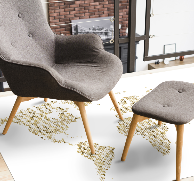 Reference: R17285En stiliseret repræsentation af verdenskortet sammensat af guldtonede firkanter, hvilket skaber et moderne og elegant udseende. Designet har en simpel, men sofistikeret kontur af kontinenter, der forbedrer den visuelle appel og giver et unikt præg til ethvert rum.
