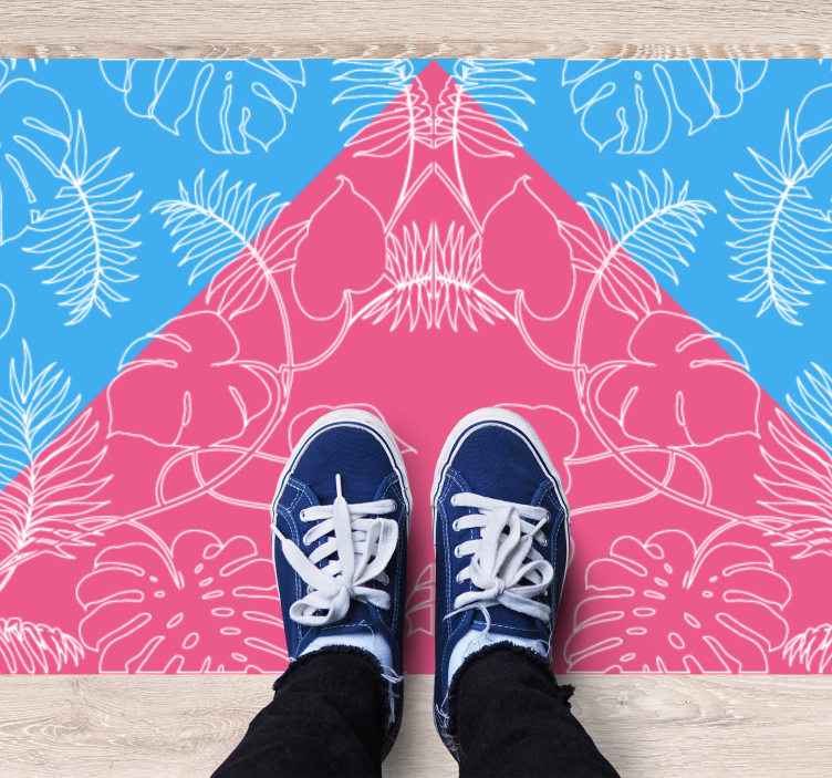 Oplev det grafiske design af vores Natur vinyl tæppe med tropisk bladmotiv, som bringer en livlig atmosfære ind i dit hjem. Den smukke kombination af trekanter, blade og geometriske former i lyserød og blå nuancer skaber en harmonisk forbindelse til naturen og tilføjer et moderne præg til dit rum.