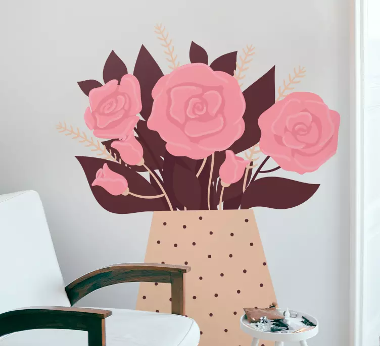 Reference: A48128En smuk blomsterkomposition med lyserøde roser arrangeret i en vase med prikker. Dette design tilføjer et strejf af elegance til ethvert rum, fejrer blomsters naturlige skønhed og skaber en varm og indbydende atmosfære.